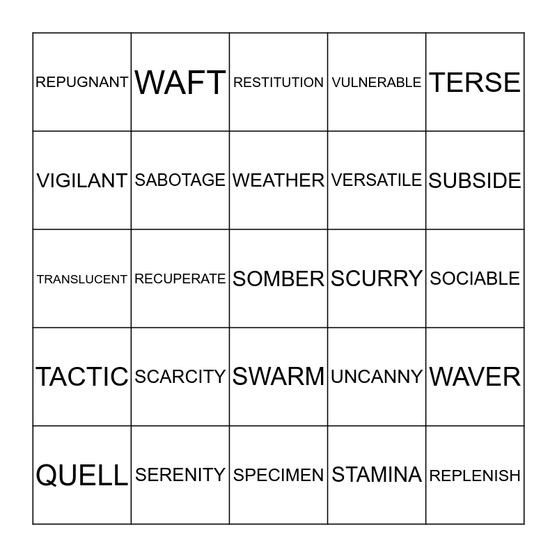 This bingo card has 29 words: QUELL, RECLUSE, RECUPERATE, REPLENISH, REPUGNANT, RESTITUTION, SABOTAGE, SCARCITY, SCURRY, SERENITY, SOCIABLE, SOMBER, SPECIMEN, STAMINA, SUBSIDE, SWAGGER, SWARM, TACTIC, TERSE, TRANSLUCENT, UNCANNY, UNSIGHTLY, VERSATILE, VIGILANT, VULNERABLE, WAFT, WAVER, WEATHER and ZEAL.