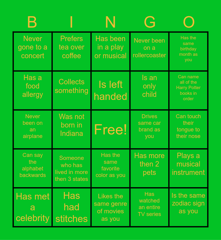 This bingo card has a free space and 24 words: Someone who has lived in more then 3 states, Has had stitches, Is left handed, Has met a celebrity, Has the same birthday month as you, Never gone to a concert, Has a food allergy, Prefers tea over coffee, Drives same car brand as you, Has the same favorite color as you, Is an only child, Never been on an airplane, Has more then 2 pets, Plays a musical instrument, Collects something, Has watched an entire TV series, Can touch their tongue to their nose, Has been in a play or musical, Can name all of the Harry Potter books in order, Was not born in Indiana, Is the same zodiac sign as you, Can say the alphabet backwards, Never been on a rollercoaster and Likes the same genre of movies as you.