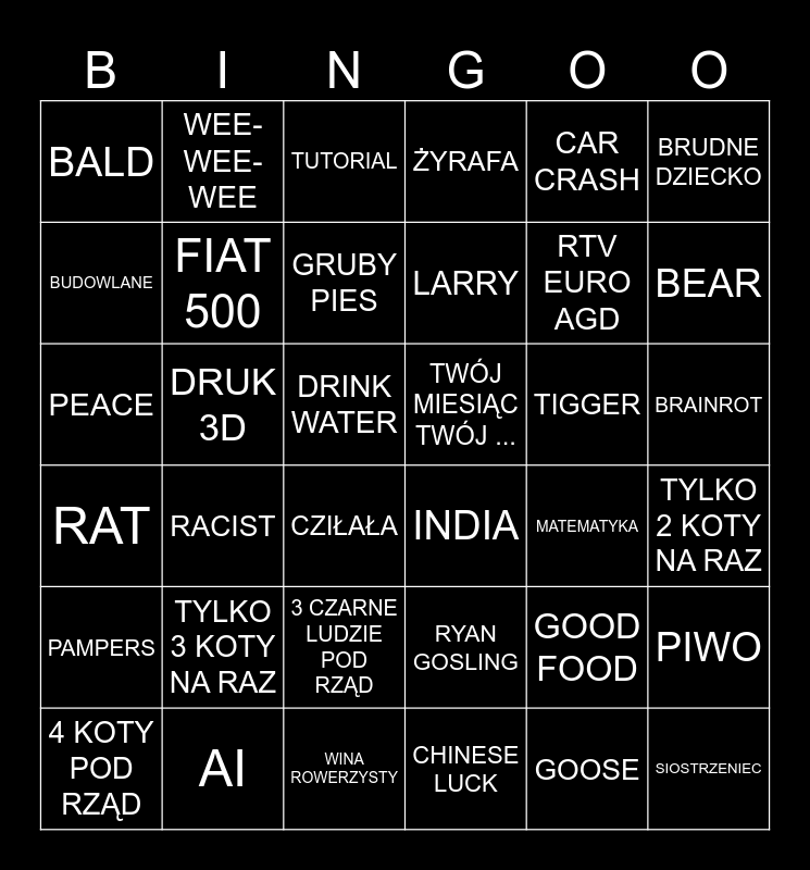 This bingo card has 36 words: RYAN GOSLING, 3 CZARNE LUDZIE POD RZĄD, CHINESE LUCK, BUDOWLANE, RAT, TWÓJ MIESIĄC TWÓJ ..., FIAT 500, WINA ROWERZYSTY, CAR CRASH, GOOD FOOD, BEAR, ŻYRAFA, PIWO, DRUK 3D, LARRY, BALD, PAMPERS, TIGGER, PEACE, TUTORIAL, DRINK WATER, RACIST, INDIA, CZIŁAŁA, MATEMATYKA, WEE-WEE-WEE, RTV EURO AGD, AI, GRUBY PIES, BRUDNE DZIECKO, SIOSTRZENIEC, 4 KOTY POD RZĄD, TYLKO 2 KOTY NA RAZ, BRAINROT, TYLKO 3 KOTY NA RAZ and GOOSE.
