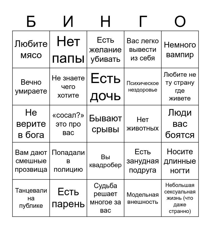 This bingo card has a free space and 24 words: Попадали в полицию, Есть парень, Есть дочь, Танцевали на публике, Немного вампир, Любите мясо, Вечно умираете, Нет папы, Нет животных, Вы квадробер, Психическое нездоровье, Не верите в бога, Есть занудная подруга, Носите длинные ногти, Не знаете чего хотите, Модельная внешность, Люди вас боятся, Есть желание убивать, Любите не ту страну где живете, «сосал?» это про вас, Небольшая сексуальная жизнь (что даже странно), Вам дают смешные прозвища, Вас легко вывести из себя and Судьба решает многое за вас.