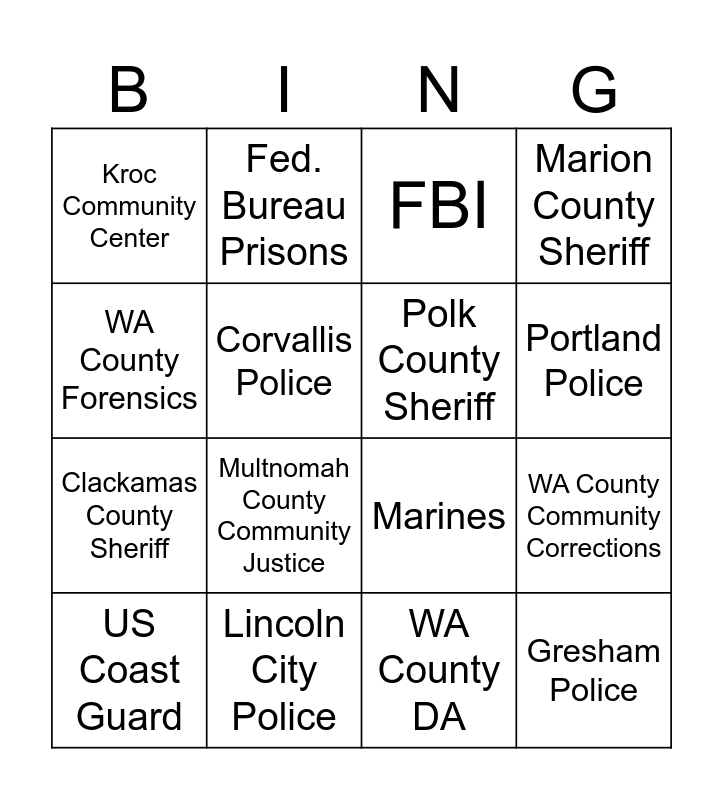 This bingo card has 28 words: Albany Police, Bend Police, Clackamas County Sheriff, Clark County Sheriff, Corvallis Police, FBI, Fed. Bureau Prisons, Gresham Police, Lincoln City Police, Linn County Sheriff, Marines, Marion County Sheriff, Marion County DA, Multnomah County Sheriff, Multnomah County Community Justice, OR Dept of Corrections, Oregon State Police, Polk County Sheriff, Portland Police, Salem Health, Kroc Community Center, Trillium Family Services, US Coast Guard, WA County Community Corrections, WA County DA, WA County Sheriff, WA County Forensics and Willamette College of Law.