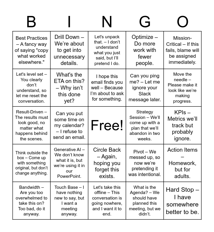 This bingo card has a free space and 43 words: Circle Back – I don’t have an answer right now, and I hope you forget about this., Hard Stop – I have somewhere better to be., Action Item – Something I’m assigning to you but not doing myself., Bandwidth – Are you too overwhelmed to take this on? Too bad, do it anyway., Deep Dive – Let’s spend way too much time overanalyzing this., What is the Agenda? – We should have planned this meeting, but we didn’t., Let's unpack that. – I don’t understand what you just said, but I’ll pretend I do., Brainstorm – Let’s throw out ideas that we’ll never actually use., Mission-Critical – If this fails, blame will be assigned immediately., Touch Base – I have nothing new to say, but I want a meeting anyway., Optimize – Do more work with fewer people., Strategy Session – We’ll come up with a plan that we’ll abandon in two weeks., Circle Back – Again, hoping you forget this exists., Generative AI – We don’t know what it is, but we’re using it in our PowerPoint., Whiteboard it – We have no idea what we’re doing, but drawing random shapes might help., Let's take this offline – This conversation is going nowhere, and I want it to end., World Class – Not actually world class, but it sounds fancy., Result-Driven – The results must look good, no matter what happens behind the scenes., Fast Track – We need this immediately, but we’ll still delay approvals for weeks., Move the needle – Please make it look like we’re making progress., Drill Down – We’re about to get into unnecessary details., Win-Win – One person wins, but we’ll pretend it benefits everyone., Scalability – Let’s hope this works when we actually try to expand., Best Practices – A fancy way of saying "copy what worked elsewhere.", Standard Operating Procedures – A huge document no one reads., KPIs – Metrics we’ll track but probably ignore., ROI – Prove this makes money or it’s getting cut., OKRs – We’ll spend more time measuring goals than achieving them., Pivot – We messed up, so now we’re pretending it was intentional., Think outside the box – Come up with something original, but don’t change anything., On my radar – I am vaguely aware of this but not doing anything about it., Action Items – Homework, but for adults., Quick win – Do the easy thing first and call it success., Can you put some time on my calendar? – I refuse to send an email., Just to clarify… – I’m about to tell you that you’re wrong, nicely., Let's not get into the weeds – I don’t actually know the details, so let’s avoid them., Per my last email – READ WHAT I ALREADY SENT YOU., I hope this email finds you well – Because I’m about to ask for something., Let's level set – You clearly don’t understand, so let me reset the conversation., Can you ping me? – Let me ignore your Slack message later., Parking lot that idea – We will never talk about this again., What's the ETA on this? – Why isn’t this done yet? and Fail Fast, Fail Forward – Make mistakes quickly so we can act like it was part of the plan..