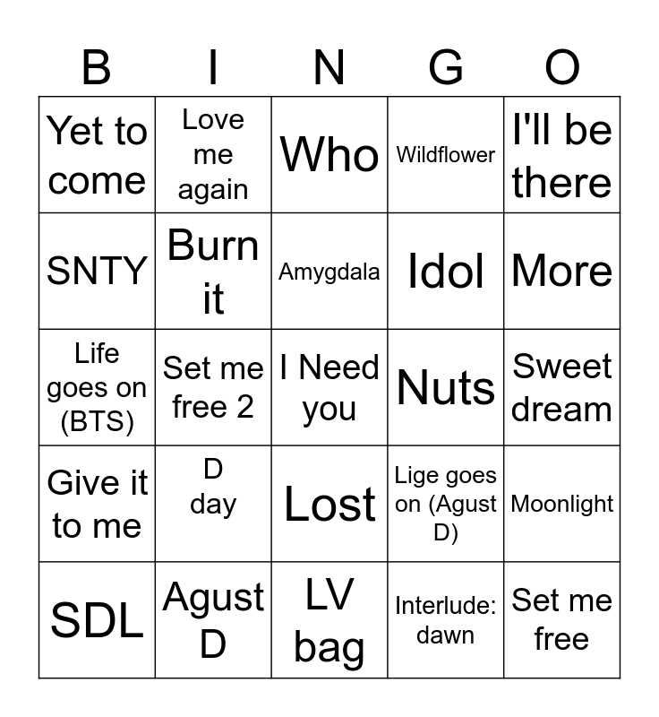 This bingo card has a free space and 24 words: D day, Agust D, Amygdala, SDL, I'll be there, Yet to come, SNTY, Love me again, Nuts, Lost, Idol, Life goes on (BTS), Lige goes on (Agust D), Moonlight, Burn it, Interlude: dawn, Sweet dream, Who, More, Set me free 2, Set me free, Give it to me, Wildflower and LV bag.