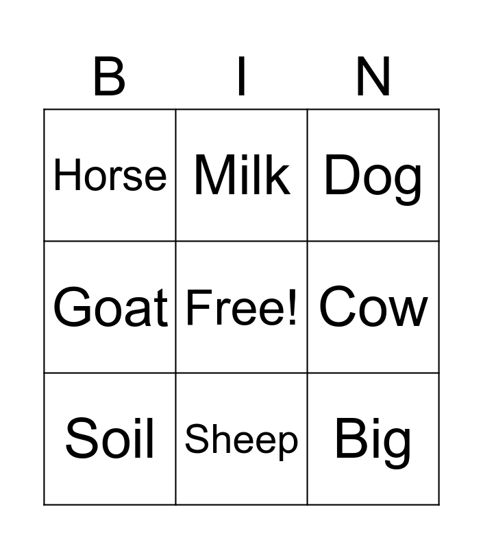 This bingo card has a free space and 8 words: Cow, Dog, Milk, Soil, Horse, Big, Goat and Sheep.