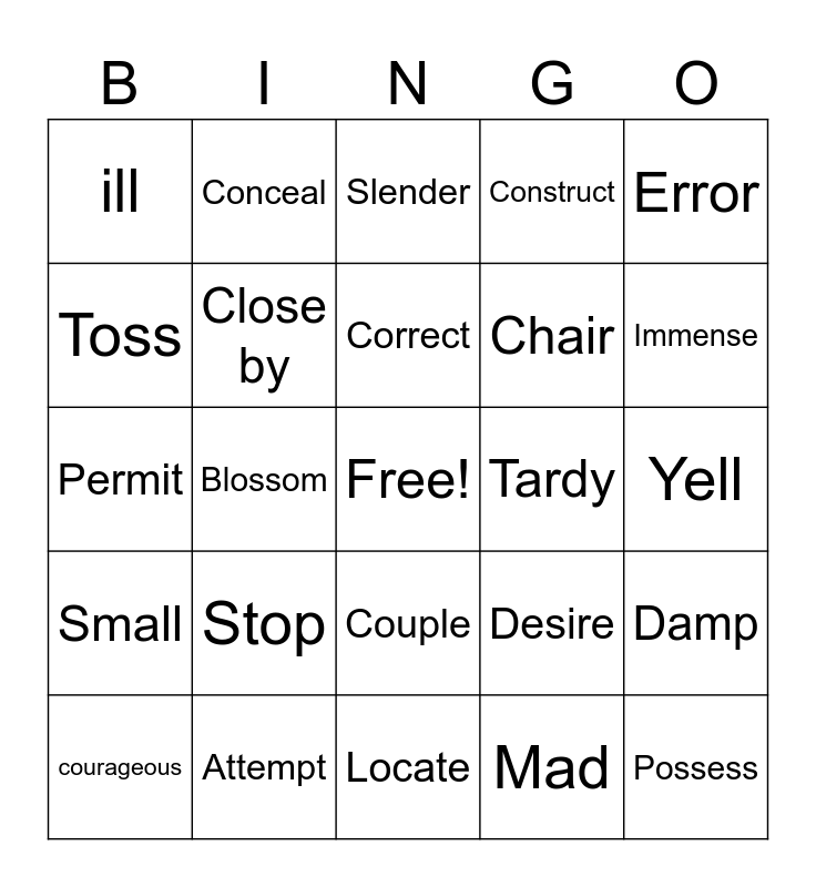 This bingo card has a free space and 34 words: Difficult, Mad, Quick, Reply, Small, Close by, Error, courageous, Conceal, Begin, Correct, Slender, Below, Gift, Tardy, Immense, Attempt, Permit, Stop, Desire, Couple, Put, ill, Yell, Locate, Possess, Construct, Wealthy, Chair, Toss, Thief, Blossom, Damp and Filthy.