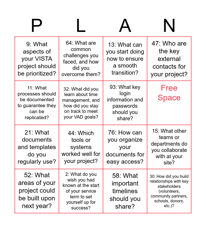 This bingo card has 16 words: 52: What areas of your project could be built upon next year?, 2: What do you wish you had known at the start of your service term to set yourself up for success?, 13: What can you start doing now to ensure a smooth transition?, 47: Who are the key external contacts for your project?, 11: What processes should be documented to guarantee they can be replicated?, 64: What are common challenges you faced, and how did you overcome them?, 76: How can you organize your documents for easy access?, 15: What other teams or departments do you collaborate with at your site?, 9: What aspects of your VISTA project should be prioritized?, 32: What did you learn about time management, and how did you stay on track to meet your VAD goals?, 58: What important timelines should you share?, Free Space, 21: What documents and templates do you regularly use?, 44: Which tools or systems worked well for your project?, 93: What key login information and passwords should you share? and 30: How did you build relationships with key stakeholders (volunteers, community partners, schools, donors, etc.)?.