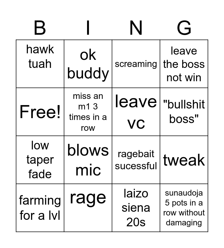 This bingo card has 16 words: rage, tweak, screaming, hawk tuah, low taper fade, ok buddy, ragebait sucessful, laizo siena 20s, Free!, miss an m1 3 times in a row, farming for a lvl, leave the boss not win, blows mic, "bullshit boss", leave vc and sunaudoja 5 pots in a row without damaging.