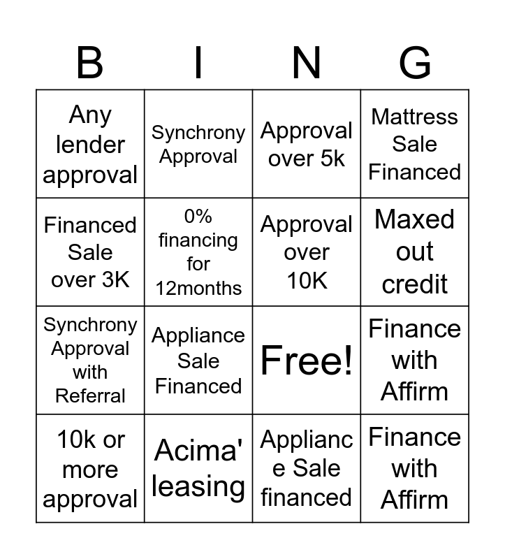 This bingo card has 21 words: Acima' leasing, 0% financing for 6 months, Synchrony Approval, Any Sale with Financing, Applianc e Sale financed, Approval over 10K, Any lender approval, Approval over 5k, Free!, Maxed out credit, Synchrony Approval with Referral, Mattress Sale Financed, Finance with Affirm, Maxed out credit, 0% financing for 12months, 3 or more apps in one day, 10k or more approval, Appliance Sale Financed, Financed Sale over 3K, Finance with Affirm and Approval over 5k.