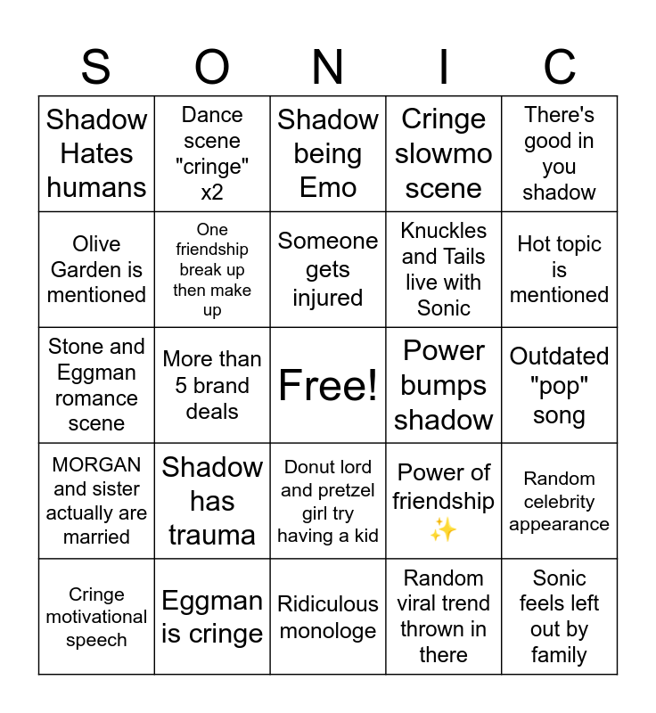 This bingo card has a free space and 24 words: Shadow has trauma, Eggman is cringe, Someone gets injured, Cringe motivational speech, There's good in you shadow, Shadow Hates humans, Olive Garden is mentioned, Dance scene "cringe" x2, Power bumps shadow, Donut lord and pretzel girl try having a kid, Knuckles and Tails live with Sonic, Stone and Eggman romance scene, Power of friendship ✨️, Random celebrity appearance, One friendship break up then make up, Random viral trend thrown in there, Outdated "pop" song, Shadow being Emo, Hot topic is mentioned, More than 5 brand deals, Sonic feels left out by family, MORGAN and sister actually are married, Cringe slowmo scene and Ridiculous monologe.