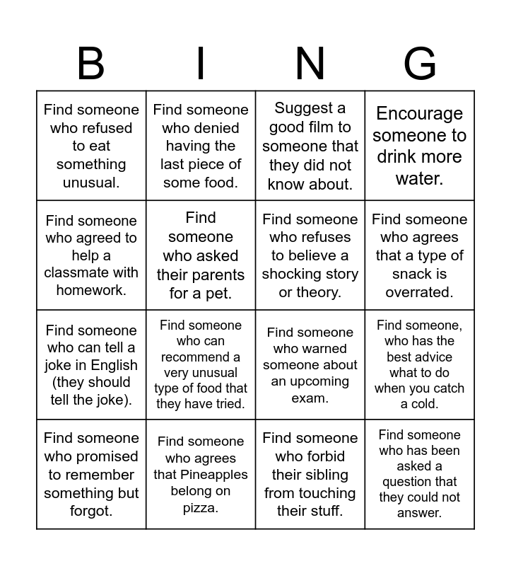 This bingo card has 16 words: Find someone who agrees that Pineapples belong on pizza., Find someone, who has the best advice what to do when you catch a cold., Suggest a good film to someone that they did not know about., Find someone who refused to eat something unusual., Find someone who can tell a joke in English (they should tell the joke)., Find someone who denied having the last piece of some food., Find someone who warned someone about an upcoming exam., Find someone who forbid their sibling from touching their stuff., Find someone who agreed to help a classmate with homework., Find someone who asked their parents for a pet., Find someone who promised to remember something but forgot., Encourage someone to drink more water., Find someone who can recommend a very unusual type of food that they have tried., Find someone who agrees that a type of snack is overrated., Find someone who refuses to believe a shocking story or theory. and Find someone who has been asked a question that they could not answer..