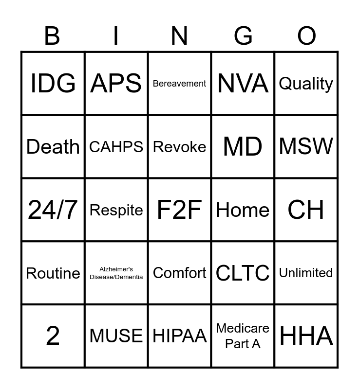 This bingo card has 35 words: GIP, Six Months, Kennedy Ulcer, CAHPS, Comfort, NVA, Death, Primary Diagnosis, Revoke, Discharge, 24/7, Quality, Free, Consents, IDG, Home, Medicare Part A, Respite, Routine, F2F, CLTC, 2, Unlimited, MUSE, Bereavement, MSW, HHA, RN, MD, CH, HL, HIPAA, Alzheimer's Disease/Dementia, APS and Visit frequency.