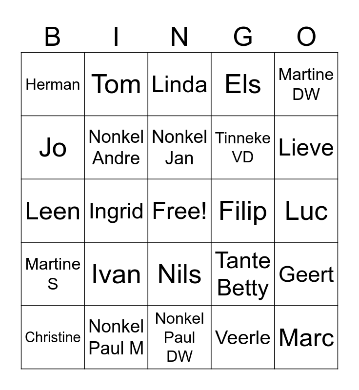 This bingo card has a free space and 65 words: Thimoty, Katrien, Ludwina, Geert, Tante Maria M, Nonkel Pol, Tom, Sofie, Nonkel Jan, Rita, Nils, Tania, Luc, Martine DW, Liesbet, Jo, Ingrid, Herman, Tante Paula, Tinneke VD, Ivan, Martine S, Els, René, Tante Maria VD, Nonkel Isidoor, Karel, Ann, Marc, Wim, Christine, Gino, Tante Lief, Sabine, Tante Betty, Nonkel Paul M, Kristien, Leen, Veerle, Geert, Nonkel Andre, Tante Astrid, Filip, Kris, Tante Jeannine, Dirk, Lieve, Jan, Nonkel Frans, Yves, Kristof, Carine, Peter, Nonkel Paul DW, Johan, Paula, Carlos, Linda, Tante Simonne, Tinneke DB, Piet, Tante Rosa, Nonkel Paul VD, Bob and Kristel.
