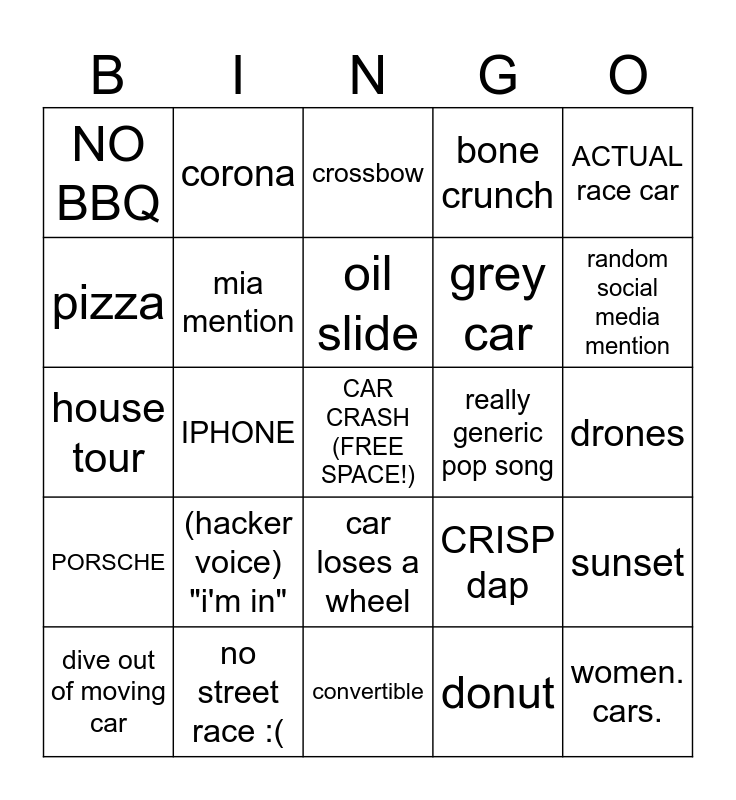 This bingo card has a free space and 24 words: (hacker voice) "i'm in", no street race :(, oil slide, dive out of moving car, ACTUAL race car, NO BBQ, pizza, corona, really generic pop song, car loses a wheel, grey car, house tour, CRISP dap, sunset, mia mention, donut, drones, crossbow, random social media mention, IPHONE, women. cars., PORSCHE, bone crunch and convertible.