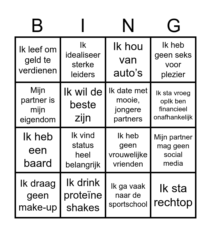 This bingo card has 63 words: Free!, Ik hou van voetbal, Ik ben niet woke, Ik begroet met een boks, Ik heb een grote lul, Ik heb wel eens gevochten, Ik idealiseer sterke leiders, Ik heb discipline, Ik sta vroeg opIk ben financieel onafhankelijk, Ik drink koffie zwart, Ik drink bier, Ik drink geen thee, Ik ga vaak naar de sportschool, Mijn partner is mijn eigendom, Ik val op vrouwen, Ik wil de beste zijn, Mijn partner mag geen social media, Ik leef om geld te verdienen, Ik huil nooit, Ik heb een baard, Ik neem ijsbaden/koude douches, Ik sta rechtop, Ik heb geen seks voor plezier, Relaties zijn transactioneel, Ik ben een alpha, Ik luister geen popmuziek, Ik doe het huishouden niet, Ik heb korte, schone nagels, Ik heb crypto, Ik lees geen romans, Ik ben lang, Ik heb een diepe stem, Ik ben technisch, Ik ben direct, Ik vind status heel belangrijk, Ik beheerst en stoïcijns, Ik ben dominant, Ik hou van gamen, Ik heb geen gevoel, Ik date met mooie, jongere partners, Ik heb geen vrouwelijke vrienden, Ik drink proteïne shakes, Ik ga nooit in bad, Ik ben zelfverzekerd, Ik draag geen make-up, Ik gebruik geweld als het moet, Ik ben succesvol, Ik heb niemand nodig, Ik kijk graag actiefilms, Ik haat winkelen, Ik mag doen wat ik wil, Ik maak graag foute grappen, Ik hou van barbecuen, Ik ben gespierd, Ik mediteer, Ik hou van auto’s, Ik drink geen 0% bier, Ik zit nooit met mijn benen over elkaar, Ik eet veel vlees, Ik draag alleen donkere kleuren, Ik draag nooit rokken of jurken, Ik hou van honden and Ik dans niet.