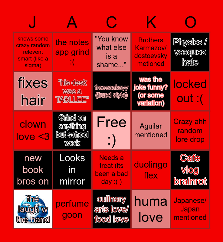 This bingo card has 1 images, a free space and 24 words: Looks in mirror, perfume goon, freeeaakayy (frued style), the laugh w the hand, Physics / vasquez hate, knows some crazy random relevent smart (like a sigma), fixes hair, the notes app grind :(, Aguilar mentioned, Needs a treat (its been a bad day :( ), was the joke funny? (or some variation), clown love <3, duolingo flex, Cafe vlog brainrot, "his desk was a TABLLEE", huma love, Crazy ahh random lore drop, "You know what else is a shame...", locked out :(, Grind on anything but school work, Japanese/ Japan mentioned, new book bros on, Brothers Karmazov/ dostoevsky metioned and culinary arts love/ food love.
