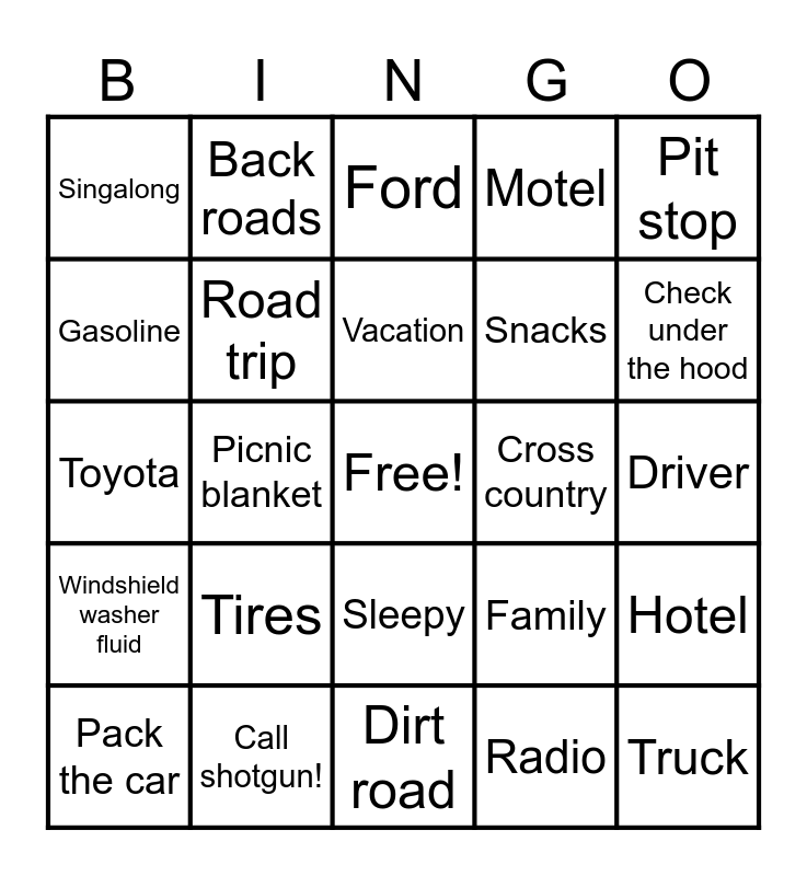 This bingo card has a free space and 49 words: Car, Truck, Highway, Dirt road, Tires, Flat tire, Back roads, Fill 'er up!, Gasoline, Diesel, Road trip, Motel, Hotel, Family, Friends, Holiday, Vacation, Cross country, Stop for lunch, Pit stop, Picnic blanket, Radio, Singalong, Snacks, Back seat, Check under the hood, Pack the car, Lisa's mini van, Sleepy, Windshield washer fluid, Clean the windows, Wash the car, Map, Stop for directions, Call shotgun!, Speed limit, Speeding ticket, Passengers, Driver, Speed demon, Passing lane, Change drivers, "We're home!", "Nearly there!", Toyota, Ford, Pick-up truck, Travel in style and Memories.