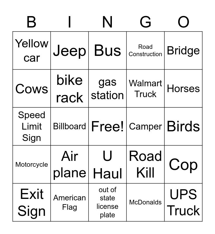 This bingo card has a free space and 28 words: Cop, Amazon Truck, Walmart Truck, McDonalds, Cows, Bus, Jeep, Motorcycle, Camper, Exit Sign, Speed Limit Sign, Road Construction, American Flag, out of state license plate, Horses, vehicle on side of road, Air plane, bike rack, gas station, U Haul, Yellow car, Corvette, UPS Truck, Billboard, Birds, Road Kill, Bridge and Rest Area.