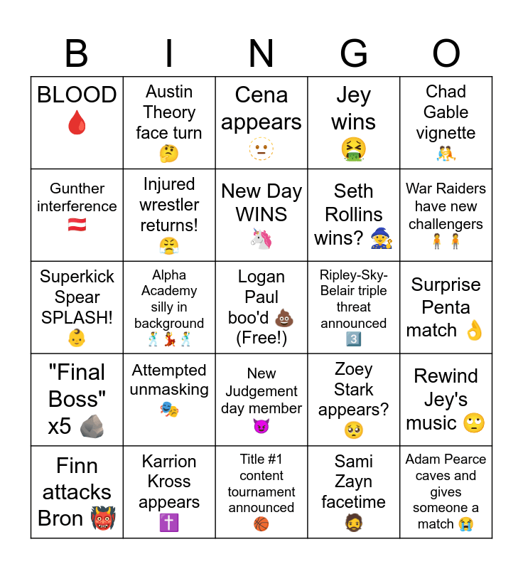 This bingo card has a free space and 24 words: Attempted unmasking 🎭, Karrion Kross appears ✝️, New Day WINS 🦄, Finn attacks Bron 👹, Chad Gable vignette 🤼, BLOOD 🩸, Gunther interference 🇦🇹, Austin Theory face turn 🤔, Ripley-Sky-Belair triple threat announced 3️⃣, New Judgement day member 😈, Seth Rollins wins? 🧙, Superkick Spear SPLASH! 👶, Zoey Stark appears? 🥺, Rewind Jey's music 🙄, Injured wrestler returns! 😤, Sami Zayn facetime 🧔, Surprise Penta match 👌, Cena appears 🫥, War Raiders have new challengers ️🧍🧍, Alpha Academy silly in background 🕺💃🕺, Adam Pearce caves and gives someone a match 😭, "Final Boss" x5 🪨, Jey wins 🤮 and Title #1 content tournament announced 🏀.