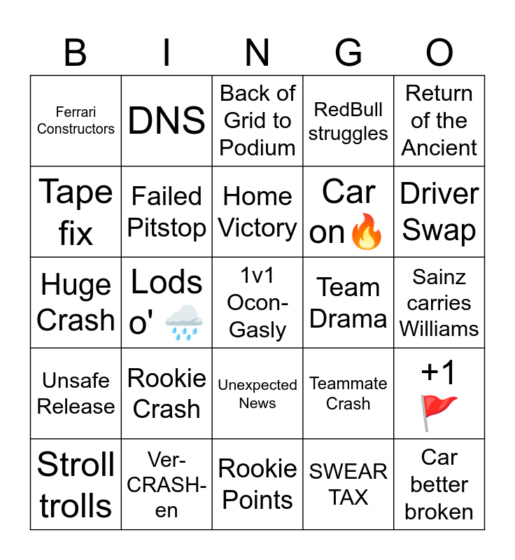 This bingo card has 25 words: Rookie Crash, Rookie Points, Home Victory, Stroll trolls, Return of the Ancient, Ferrari Constructors, Tape fix, DNS, Team Drama, Unexpected News, Car on๐ฅ, Huge Crash, Teammate Crash, +1 ๐ฉ, Failed Pitstop, Car better broken, Sainz carries Williams, Back of Grid to Podium, Driver Swap, Lods o' ๐ง๏ธ, 1v1 Ocon-Gasly, Ver-CRASH-en, Unsafe Release, RedBull struggles and SWEAR TAX.