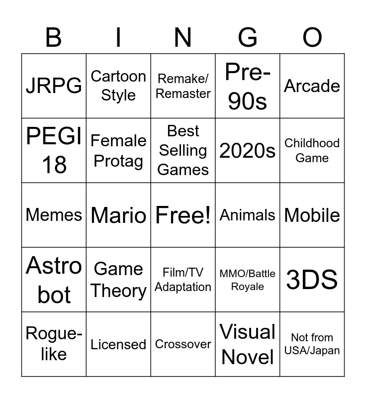 This bingo card has a free space and 24 words: Game Theory, Licensed, Best Selling Games, Rogue-like, Arcade, JRPG, PEGI 18, Cartoon Style, Animals, Film/TV Adaptation, 2020s, Memes, MMO/Battle Royale, 3DS, Female Protag, Visual Novel, Mobile, Remake/ Remaster, Childhood Game, Mario, Not from USA/Japan, Astro bot, Pre-90s and Crossover.
