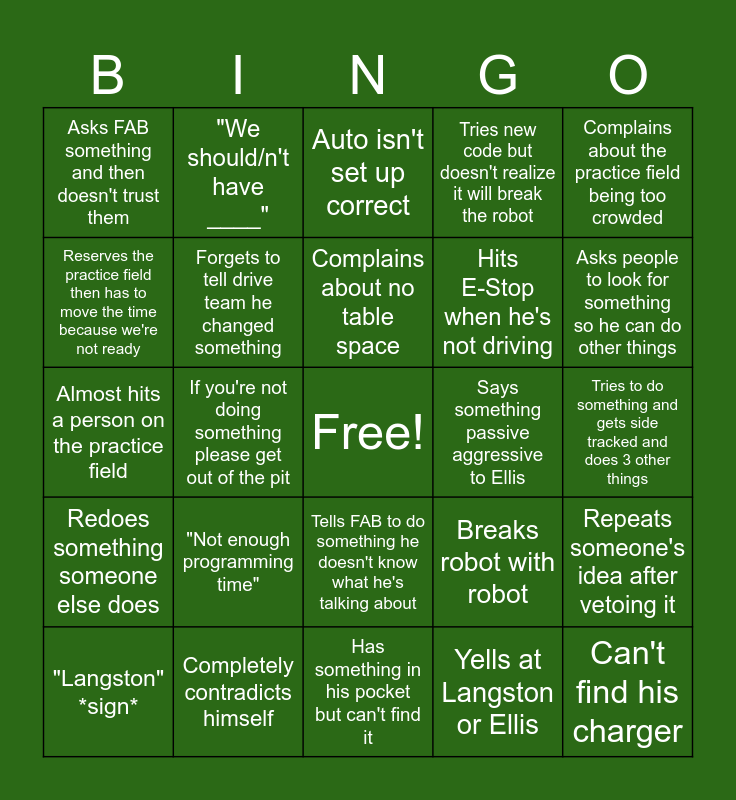 This bingo card has a free space and 29 words: "Langston" *sign*, Controller wires wrapped wrong, If you're not doing something please get out of the pit, "Please stop eating by the robot", Asks FAB something and then doesn't trust them, Auto isn't set up correct, Forgets to tell drive team he changed something, "Not enough programming time", Says something passive aggressive to Ellis, Completely contradicts himself, Tries to do something and gets side tracked and does 3 other things, Can't find his charger, Has something in his pocket but can't find it, Yells at Langston or Ellis, Asks people to look for something so he can do other things, Blames drive team for breaking something, Tells FAB to do something he doesn't know what he's talking about, Redoes something someone else does, Complains about the practice field being too crowded, Almost hits a person on the practice field, Breaks robot with robot, "Lets be a little bit more careful", Hits E-Stop when he's not driving, Reserves the practice field then has to move the time because we're not ready, Tries new code but doesn't realize it will break the robot, "We should/n't have ____", Repeats someone's idea after vetoing it, Complains about no table space and Freaks out because the robot cart is too messy.