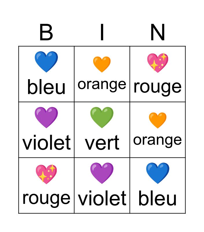 This bingo card has 14 words: ๐ jaune, ๐ vert, ๐ bleu, ๐ violet, ๐งก orange, ๐ rouge, ๐ rose, ๐ jaune, ๐ vert, ๐ bleu, ๐ violet, ๐งก orange, ๐ rouge and ๐ rose.