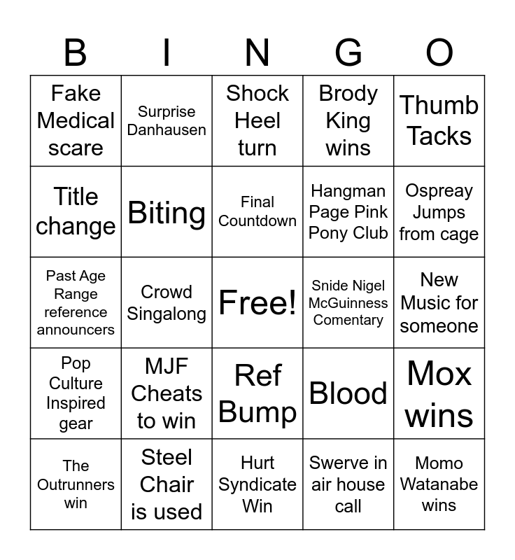 This bingo card has a free space and 24 words: MJF Cheats to win, Steel Chair is used, Final Countdown, The Outrunners win, Thumb Tacks, Fake Medical scare, Title change, Surprise Danhausen, Snide Nigel McGuinness Comentary, Ref Bump, Hangman Page Pink Pony Club, Past Age Range reference announcers, Blood, Mox wins, Biting, Swerve in air house call, New Music for someone, Shock Heel turn, Ospreay Jumps from cage, Crowd Singalong, Momo Watanabe wins, Pop Culture Inspired gear, Brody King wins and Hurt Syndicate Win.
