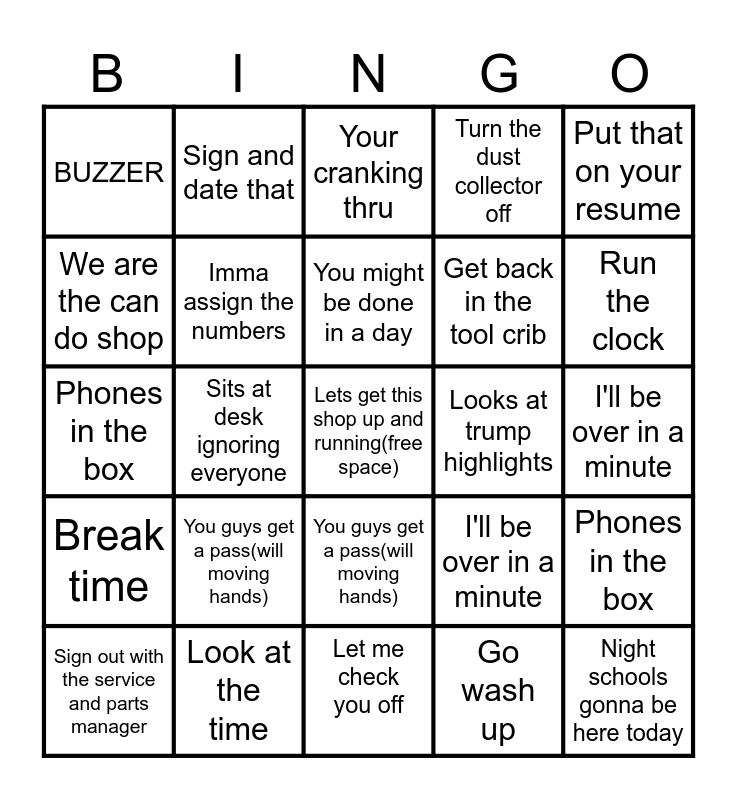 This bingo card has a free space and 48 words: I care about you, Night schools gonna be here today, Sign out with the service and parts manager, Let me check you off, You guys get a pass(will moving hands), Break time, Sign and date that, Hand wave during pledge, We are the can do shop, Put your safety glasses on, Imma assign the numbers, Turn the dust collector off, Phones in the box, I'll be over in a minute, Get your tool kit, Look at the time, You might be done in a day, Looks at trump highlights, Your cranking thru, Put that on your resume, Sits at desk ignoring everyone, Go wash up, BUZZER, Get back in the tool crib, I care about you, Run the clock, Sign out with the service and parts manager, Imma assign the numbers, You guys get a pass(will moving hands), Break time, Sign and date that, hand wave during pledge, Put your safety glasses on, Sits at desk ignoring everyone, Look at the time, We are the can do shop, Get your tool kit, I'll be over in a minute, Get back in the tool crib, Go wash up, Turn the dust collector off, You might be done in a day, Your cranking thru, Night schools gonna be here today, Phones in the box, Put that on your resume, Let me check you off and BUZZER.