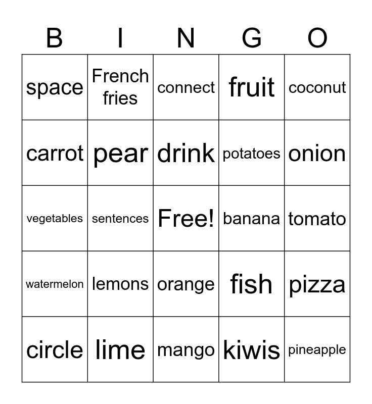 This bingo card has a free space and 29 words: circle, words, sentences, correct, space, connect, pear, lemons, banana, lime, tomato, pineapple, mango, kiwis, onion, apple, orange, watermelon, coconut, vegetables, fish, meat, potatoes, carrot, fruit, French fries, pizza, drink and eat.
