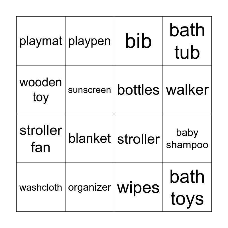 This bingo card has 24 words: Free!, book, walker, teether, wooden toy, playmat, sunscreen, playpen, organizer, onesie, stroller fan, stroller, swaddle, stuffed animal, bottles, diapers, wipes, bib, blanket, baby shampoo, washcloth, bath toys, bath tub and pajamas.