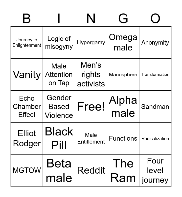 This bingo card has a free space and 29 words: MGTOW, Red Pill, Gender Based Violence, Gynocentric, Journey to Enlightenment, Hypergamy, Male Attention on Tap, Black Pill, Alpha male, Beta male, Sandman, Four level journey, Reddit, The Ram, Transformation, The Matrix, Male Entitlement, Elliot Rodger, Anonymity, Echo Chamber Effect, Functions, Purple Pill, Manosphere, Vanity, Omega male, Logic of misogyny, Radicalization, Men’s rights activists and Manifesto.
