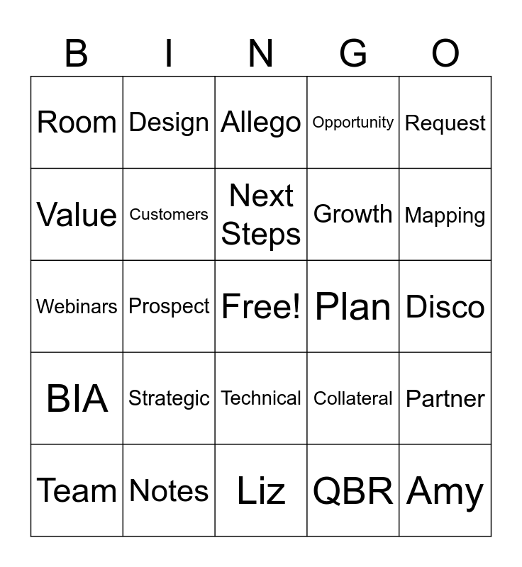 This bingo card has a free space and 24 words: Strategic, Notes, Next Steps, Team, Request, Room, Value, Design, Plan, Technical, Growth, Webinars, Collateral, Partner, Customers, QBR, Disco, Allego, Mapping, Prospect, Amy, BIA, Opportunity and Liz.