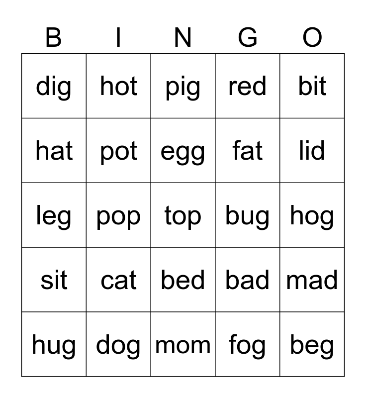 This bingo card has a free space and 24 words: cat, dog, egg, hug, bit, dig, hat, hot, bug, bed, fat, leg, bad, mad, pot, fog, hog, pig, lid, pop, beg, sit, red and mom.
