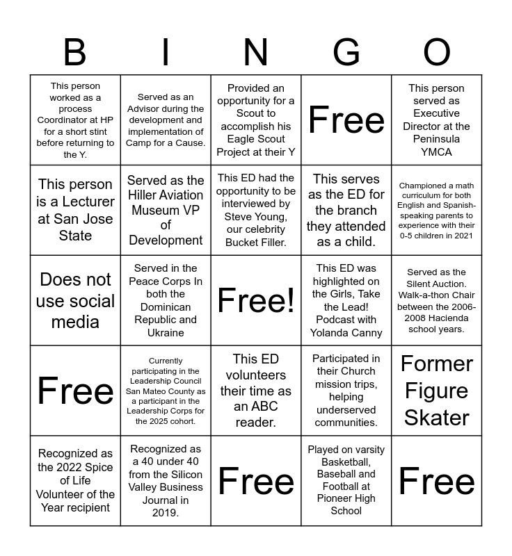 This bingo card has a free space and 24 words: Currently participating in the Leadership Council San Mateo County as a participant in the Leadership Corps for the 2025 cohort., Recognized as a 40 under 40 from the Silicon Valley Business Journal in 2019., This ED had the opportunity to be interviewed by Steve Young, our celebrity Bucket Filler., Recognized as the 2022 Spice of Life Volunteer of the Year recipient, This person served as Executive Director at the Peninsula YMCA, This person worked as a process Coordinator at HP for a short stint before returning to the Y., This person is a Lecturer at San Jose State, Served as an Advisor during the development and implementation of Camp for a Cause., This ED was highlighted on the Girls, Take the Lead! Podcast with Yolanda Canny, This ED volunteers their time as an ABC reader., This serves as the ED for the branch they attended as a child., Does not use social media, Participated in their Church mission trips, helping underserved communities., Former Figure Skater, Served as the Hiller Aviation Museum VP of Development, Played on varsity Basketball, Baseball and Football at Pioneer High School, Served as the Silent Auction. Walk-a-thon Chair between the 2006- 2008 Hacienda school years., Provided an opportunity for a Scout to accomplish his Eagle Scout Project at their Y, Championed a math curriculum for both English and Spanish-speaking parents to experience with their 0-5 children in 2021, Served in the Peace Corps In both the Dominican Republic and Ukraine, Free, Free, Free and Free.
