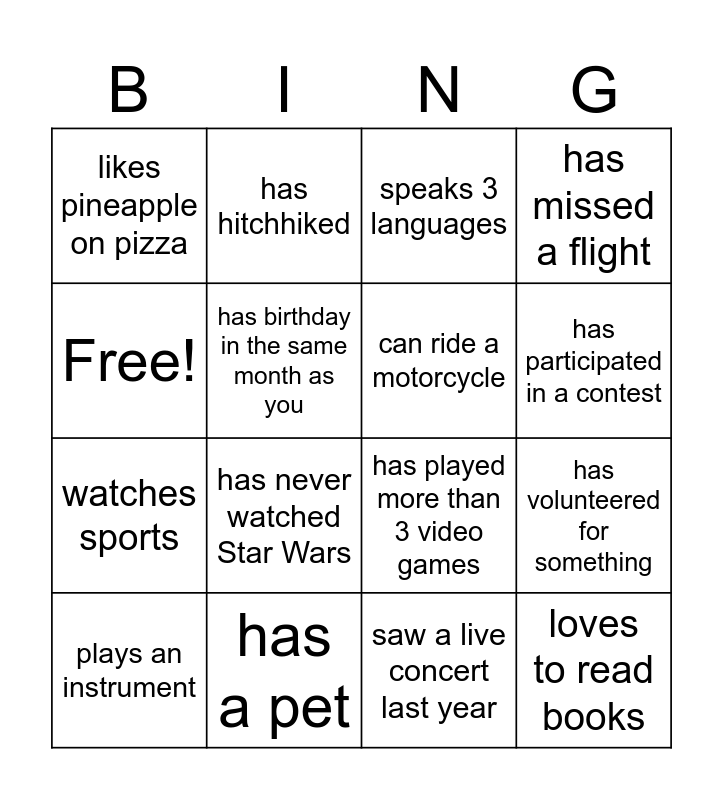 This bingo card has 16 words: has a pet, has volunteered for something, speaks 3 languages, likes pineapple on pizza, watches sports, has hitchhiked, has played more than 3 video games, saw a live concert last year, Free!, has birthday in the same month as you, plays an instrument, has missed a flight, has never watched Star Wars, has participated in a contest, can ride a motorcycle and loves to read books.