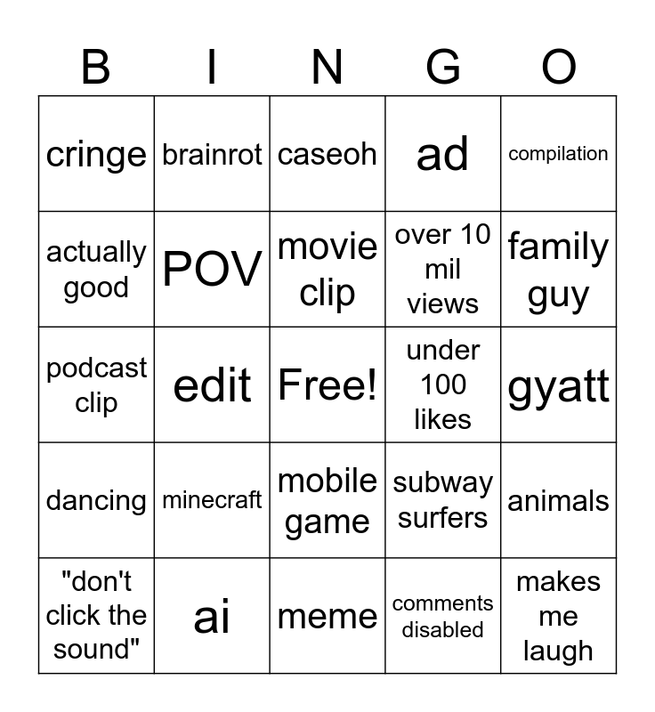 This bingo card has a free space and 24 words: minecraft, ai, movie clip, "don't click the sound", compilation, cringe, actually good, brainrot, under 100 likes, mobile game, over 10 mil views, podcast clip, subway surfers, animals, POV, comments disabled, gyatt, caseoh, family guy, edit, makes me laugh, dancing, ad and meme.