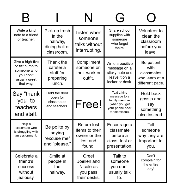 This bingo card has a free space and 24 words: Celebrate a friend’s success without jealousy., Be polite by saying “excuse me” and “please.”, Compliment someone on their work or outfit., Talk to someone you don’t usually talk to., Volunteer to clean the classroom before you leave., Write a kind note to a friend or teacher., Pick up trash in the hallway, dining hall or classroom., Listen when someone talks without interrupting., Text a kind message to a family member (when you get your phone back for dismissal)., Hold back gossip and say something nice instead., Say “thank you” to teachers and staff., Thank the cafeteria staff for preparing lunch., Encourage a classmate before a class, test or presentation., Tell someone why they are important to you., Give a high-five or fist bump to someone who you don’t usually greet that way., Smile at people in the hallway., Greet Joellen and Nicole as you pass their desks., Share school supplies with someone who forgot theirs., Be patient with classmates who learn at a different pace., Help a classmate who is struggling with an assignment., Hold the door open for classmates and teachers., Return lost items to their owner or the lost and found., Write a positive message on a sticky note and leave it on a locker or desk. and Don’t complain for the entire day!.