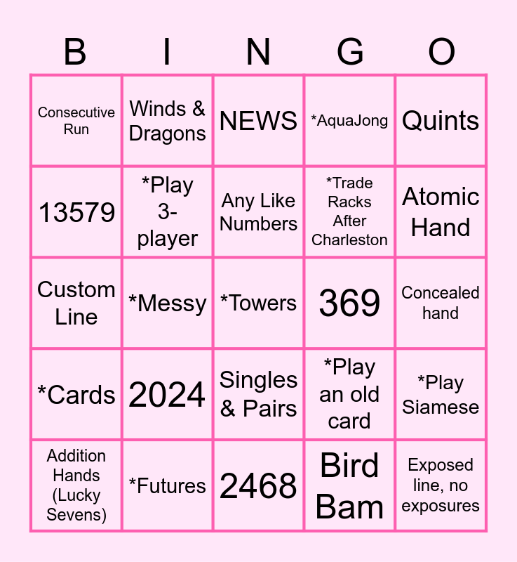 This bingo card has 25 words: 2024, 2468, Any Like Numbers, Addition Hands (Lucky Sevens), Quints, Consecutive Run, 13579, Winds & Dragons, 369, Singles & Pairs, *Trade Racks After Charleston, Custom Line, *Play an old card, *Play Siamese, *Play 3-player, Exposed line, no exposures, Concealed hand, NEWS, Atomic Hand, *Messy, *Towers, *Futures, *Cards, *AquaJong and Bird Bam.