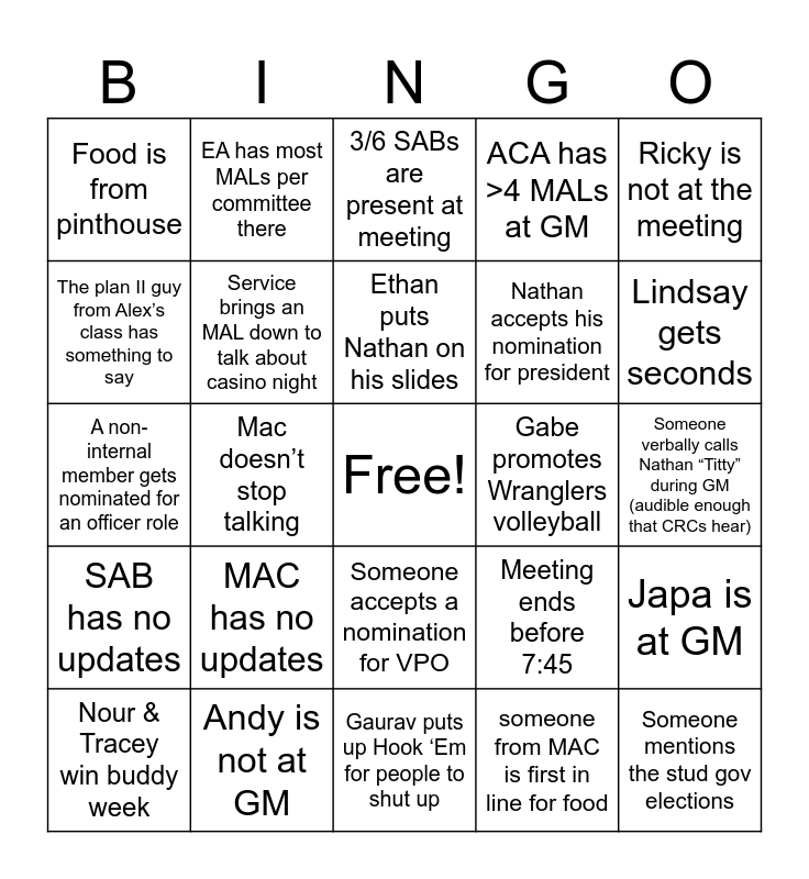 This bingo card has a free space and 25 words: MAC has no updates, Gaurav puts up Hook ‘Em for people to shut up, Ethan puts Nathan on his slides, Nour & Tracey win buddy week, Ricky is not at the meeting, Food is from pinthouse, The plan II guy from Alex’s class has something to say, EA has most MALs per committee there, Gabe promotes Wranglers volleyball, Someone accepts a nomination for VPO, Nathan accepts his nomination for president, A non-internal member gets nominated for an officer role, Meeting ends before 7:45, Japa is at GM, Service brings an MAL down to talk about casino night, A non-internal member accepts their nomination for an officer role, Someone verbally calls Nathan “Titty” during GM (audible enough that CRCs hear), 3/6 SABs are present at meeting, Lindsay gets seconds, Mac doesn’t stop talking, Someone mentions the stud gov elections, Andy is not at GM, SAB has no updates, ACA has >4 MALs at GM and someone from MAC is first in line for food.