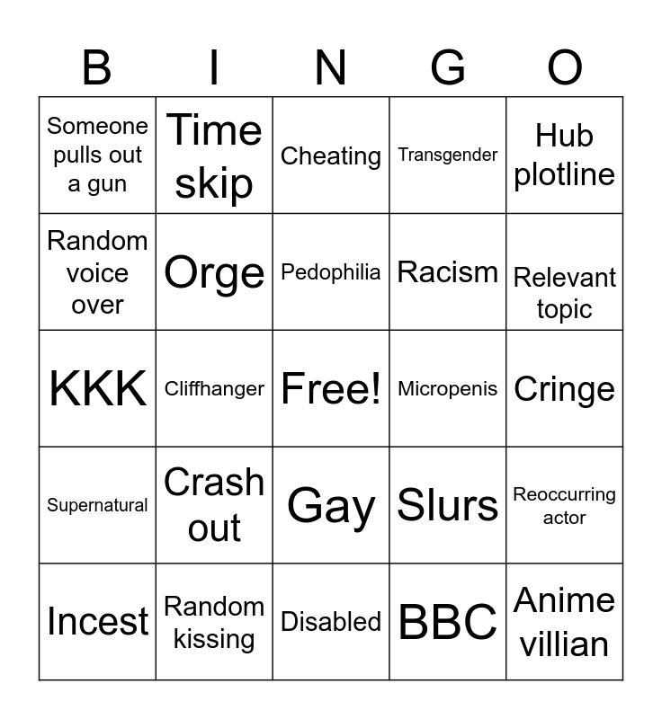 This bingo card has a free space and 24 words: Crash out, Random kissing, Pedophilia, Incest, Hub plotline, Someone pulls out a gun, Random voice over, Time skip, Micropenis, Gay, Racism, KKK, Slurs, Reoccurring actor, Orge, BBC, Cringe, Cheating, Relevant topic, Cliffhanger, Anime villian, Supernatural, Transgender and Disabled.