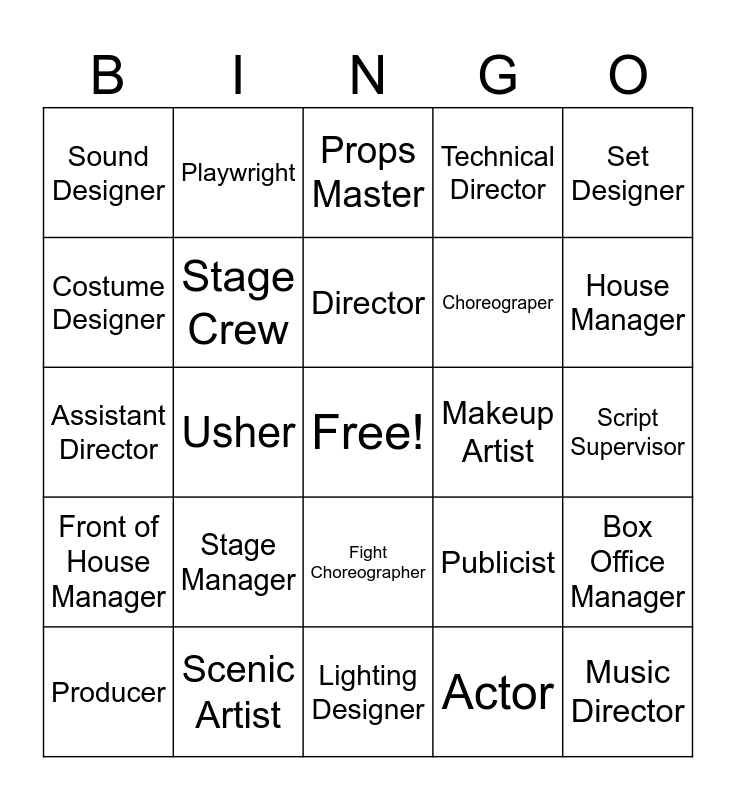 This bingo card has a free space and 25 words: Stage Manager, Lighting Designer, Director, Producer, Set Designer, Sound Designer, Costume Designer, Playwright, Makeup Artist, Fight Choreographer, Choreograper, Assistant Director, Publicist, Box Office Manager, Stage Crew, Dramaturg, Script Supervisor, Props Master, House Manager, Usher, Music Director, Scenic Artist, Front of House Manager, Technical Director and Actor.