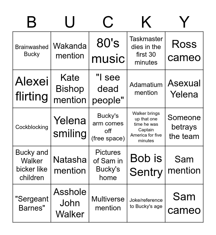 This bingo card has a free space and 24 words: Natasha mention, Asshole John Walker, "I see dead people", "Sergeant Barnes", Ross cameo, Brainwashed Bucky, Alexei flirting, Wakanda mention, Walker brings up that one time he was Captain America for five minutes, Pictures of Sam in Bucky's home, Adamatium mention, Cockblocking, Bob is Sentry, Sam mention, Kate Bishop mention, Joke/reference to Bucky's age, Someone betrays the team, 80's music, Asexual Yelena, Yelena smiling, Sam cameo, Bucky and Walker bicker like children, Taskmaster dies in the first 30 minutes and Multiverse mention.
