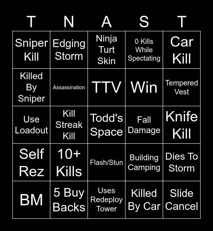 This bingo card has a free space and 24 words: 10+ Kills, 5 Buy Backs, TTV, BM, Car Kill, Sniper Kill, Killed By Sniper, Edging Storm, Fall Damage, Flash/Stun, Win, Use Loadout, Building Camping, Dies To Storm, Assassination, Killed By Car, Knife Kill, Ninja Turt Skin, Tempered Vest, Kill Streak Kill, Slide Cancel, Self Rez, 0 Kills While Spectating and Uses Redeploy Tower.