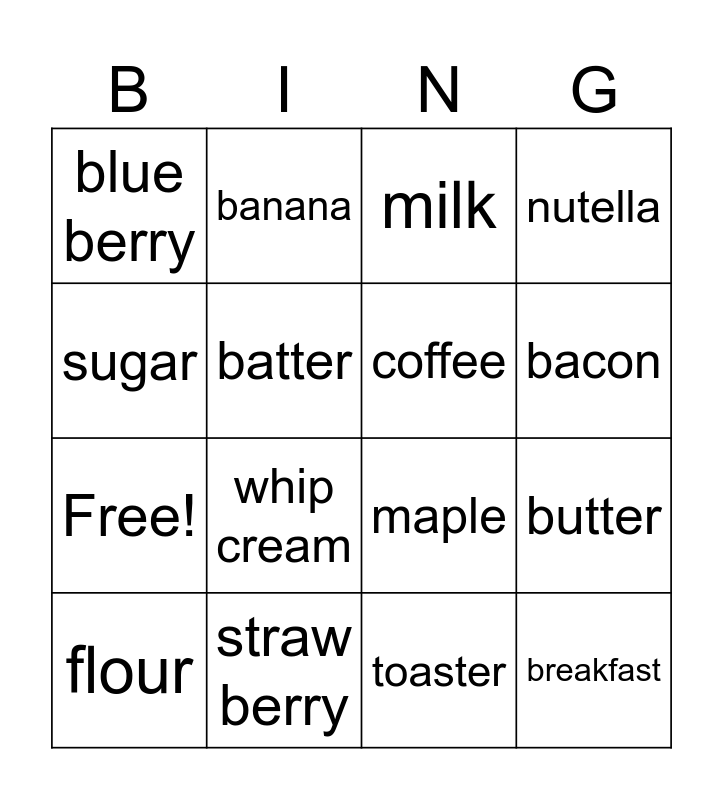 This bingo card has 20 words: butter, syrup, milk, eggs, flour, sugar, straw berry, blue berry, Free!, banana, whip cream, maple, batter, breakfast, coffee, juice, bacon, nutella, toaster and cooking.