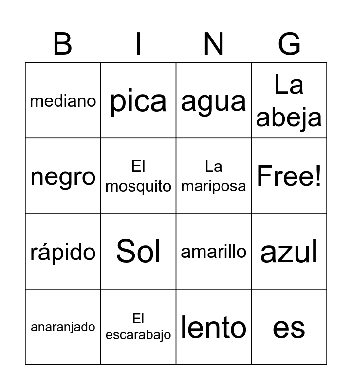 This bingo card has 35 words: La cucaracha, La mosca, La hormiga, La mariposa, La mariquita, La abeja, El mosquito, Yo veo, Free!, café, amarillo, negro, grande, pequeño, mediano, El escarabajo, rojo, azul, es, anaranjado, jardin, flor, hoja, planta, agua, Sol, bonita, feo, rápido, lento, peludo, me gusta, no me gusta, pica and porque.