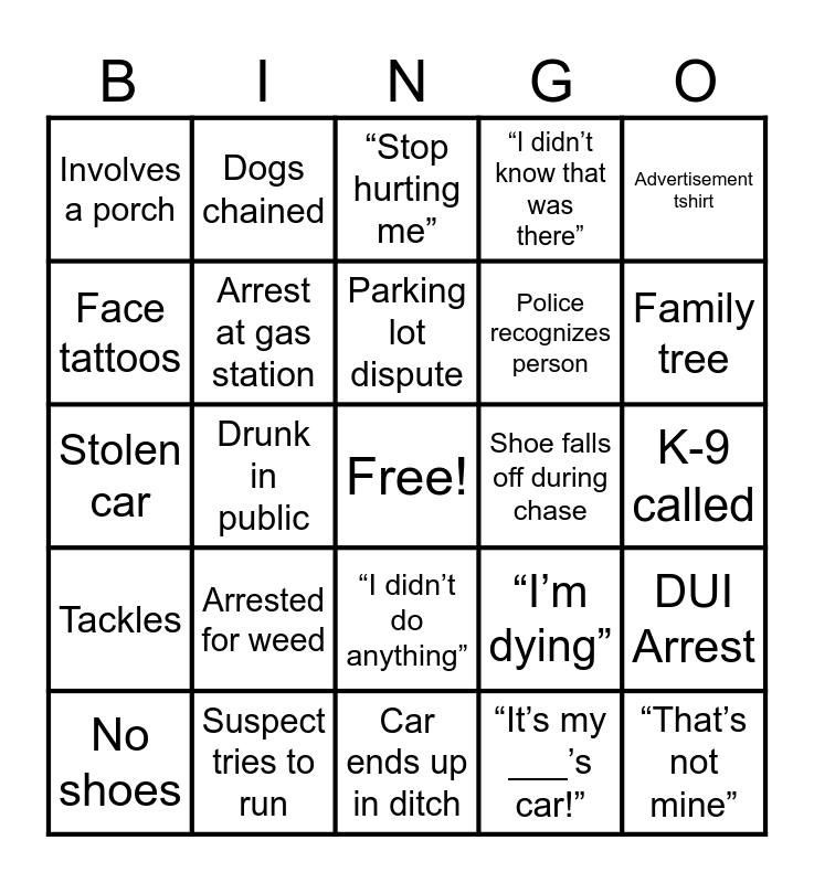 This bingo card has a free space and 24 words: Arrested for weed, Suspect tries to run, Parking lot dispute, No shoes, Advertisement tshirt, Involves a porch, Face tattoos, Dogs chained, Shoe falls off during chase, “I didn’t do anything”, Police recognizes person, Stolen car, “I’m dying”, DUI Arrest, Arrest at gas station, “It’s my ___’s car!”, K-9 called, “Stop hurting me”, Family tree, Drunk in public, “That’s not mine”, Tackles, “I didn’t know that was there” and Car ends up in ditch.