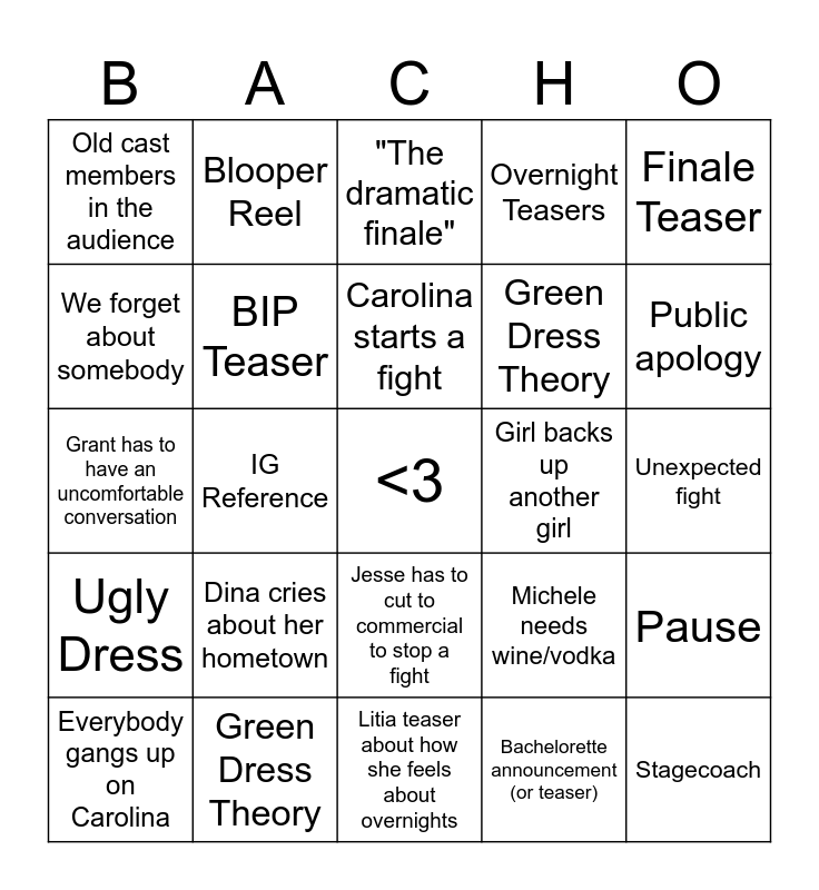 This bingo card has a free space and 24 words: Dina cries about her hometown, Green Dress Theory, Carolina starts a fight, Everybody gangs up on Carolina, Finale Teaser, Old cast members in the audience, We forget about somebody, Blooper Reel, Girl backs up another girl, Jesse has to cut to commercial to stop a fight, Green Dress Theory, Grant has to have an uncomfortable conversation, Michele needs wine/vodka, Pause, BIP Teaser, Bachelorette announcement (or teaser), Unexpected fight, "The dramatic finale", Public apology, IG Reference, Stagecoach, Ugly Dress, Overnight Teasers and Litia teaser about how she feels about overnights.