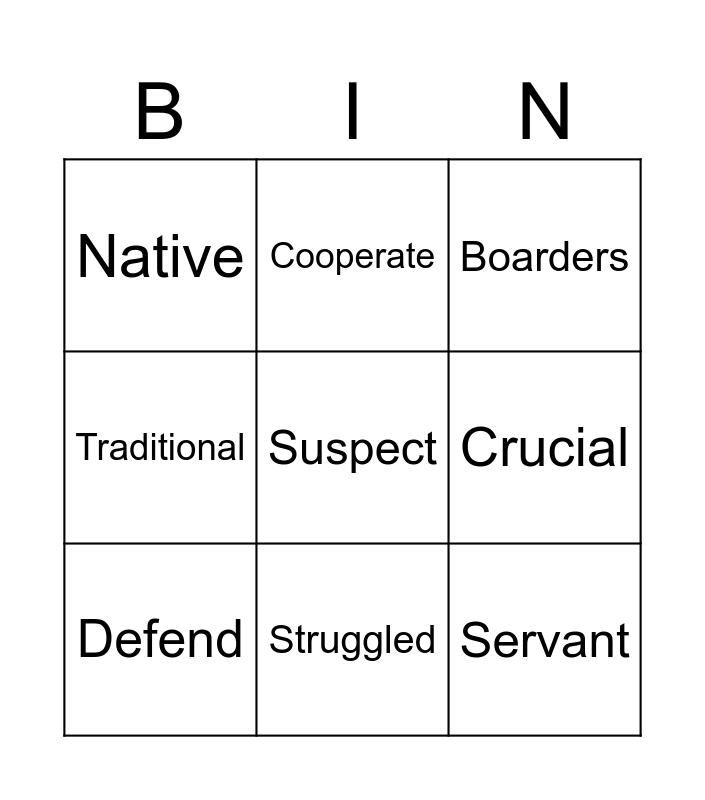 This bingo card has a free space and 11 words: Enslaved, Struggled, Servant, Defend, Cooperate, Boarders, Crucial, Culture, Traditional, Native and Served.