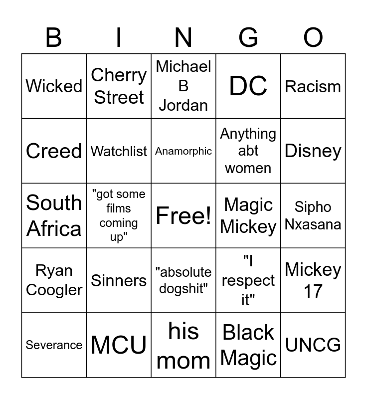 This bingo card has a free space and 24 words: Sinners, MCU, Anamorphic, Severance, Racism, Wicked, Creed, Cherry Street, Magic Mickey, "absolute dogshit", Anything abt women, South Africa, "I respect it", Mickey 17, Watchlist, Black Magic, Sipho Nxasana, Michael B Jordan, Disney, "got some films coming up", UNCG, Ryan Coogler, DC and his mom.