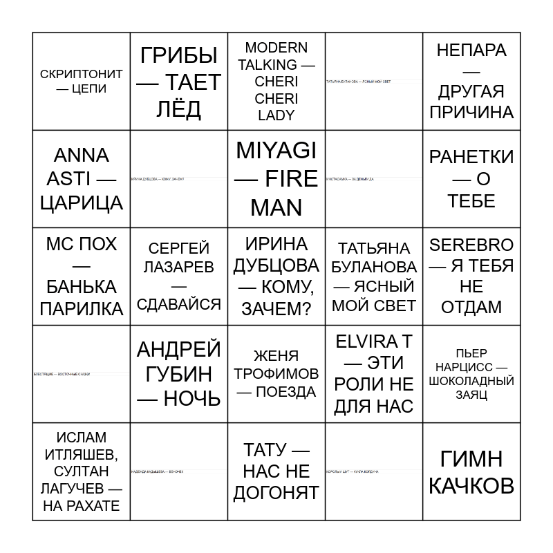 This bingo card has 10 images and 51 words: Free!, НАДЕЖДА КАДЫШЕВА — ВЕНОЧЕК, АNNA ASTI —ЦАРИЦА, БЛЕСТЯЩИЕ — ВОСТОЧНЫЕ СКАЗКИ, КОРОЛЬ И ШУТ — КУКЛА КОЛДУНА, СКРИПТОНИТ — ЦЕПИ, ИРИНА ДУБЦОВА — КОМУ, ЗАЧЕМ?, НЕПАРА — ДРУГАЯ ПРИЧИНА, ИНСТАСАМКА — ЗА ДЕНЬГИ ДА, MIYAGI — FIRE MAN, ТАТЬЯНА БУЛАНОВА — ЯСНЫЙ МОЙ СВЕТ, MODERN TALKING — CHERI CHERI LADY, ИСЛАМ ИТЛЯШЕВ, СУЛТАН ЛАГУЧЕВ — НА РАХАТЕ, ПЬЕР НАРЦИСС — ШОКОЛАДНЫЙ ЗАЯЦ, МАКSИМ — ЗНАЕШЬ ЛИ ТЫ, ОТПУСТИ И ЗАБУДЬ (OST «ХОЛОДНОЕ СЕРДЦЕ»), ЛАДА ДЭНС — ДЕВОЧКА НОЧЬ, ARTIK & ASTI — ГРУСТНЫЙ ДЭНС, РАНЕТКИ — О ТЕБЕ, MARY GU — КОСИЧКИ, SQWOZ BAB — ОЗЕРО В ЛЕСУ, XOLIDAYBOY — ХУЛИГАНКА, ВОРОВАЙКИ — ХОП, МУСОРОК, MORANDI — ANGELS, ГРИБЫ — ТАЕТ ЛЁД, 5STA FAMILY — Я БУДУ, THE BLACK EYED PEAS — PUMP IT, СЕРГЕЙ ЛАЗАРЕВ — СДАВАЙСЯ, ЛЕОНИД АГУТИН — АЭРОПОРТЫ, МС ПОХ — БАНЬКА ПАРИЛКА, ВАЛЕРИЙ МЕЛАДЗЕ — ИНОСТРАНЕЦ, АНДРЕЙ ГУБИН — НОЧЬ, SEREBRO — Я ТЕБЯ НЕ ОТДАМ, КРОСЫ — ЧУЧУКА, ELVIRA T — ЭТИ РОЛИ НЕ ДЛЯ НАС, DJ PILIGRIM — ТЫ МЕНЯ ЗАБУДЬ, БРАТЬЯ ГРИМ — РЕСНИЦЫ, СВЕТЛАНА ЛОБОДА — К ЧЁРТУ ЛЮБОВЬ, ПАСКАЛЬ — ШЁЛКОВОЕ СЕРДЦЕ, ЖЕНЯ ТРОФИМОВ — ПОЕЗДА, ТАТУ — НАС НЕ ДОГОНЯТ, MARKUL — СТРЕЛЫ, ATL — В ВЫСОКОЙ ТРАВЕ, TREMETRA — ДННБ, КОРНИ — 25 ЭТАЖ, FACE — ЮМОРИСТ, ARASH — BORO BORO, ВАЛЕРИЯ — МАЛЕНЬКИЙ САМОЛЕТ, ФИЛИПП КИРКОРОВ — Я ЭТУ ЖИЗНЬ ТЕБЕ ОТДАМ, ГИМН КАЧКОВ and ЖАННА ФРИСКЕ — МАЛИНКИ.